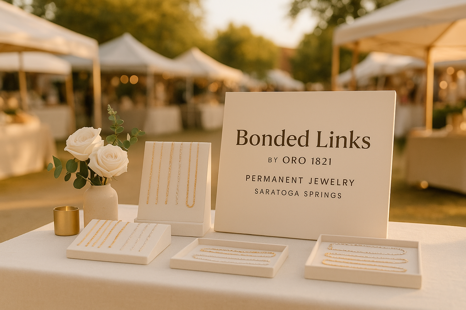 Look for Bonded Links at bridal expos and some of your favorite markets and festivals. Our signature setup invites guests to see permanent jewelry in action, get linked on site, and explore package options for weddings, parties, and special events.
